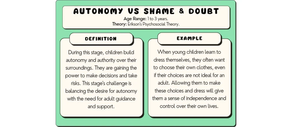 From a developmental standpoint, this stage is most closely aligned with Erik Erikson’s “autonomy versus shame and doubt” theory. He stated that toddlers, typically between 18 months and 3 years, must navigate the balance between asserting independence and feeling secure in their decisions. If consistently supported, children emerge with confidence and self-trust. If overly restricted or criticized, they may develop doubt in their own abilities.