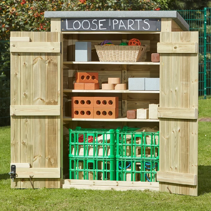 Outdoor storage cabinets or sheds for tools, loose parts, and daily activity materials.