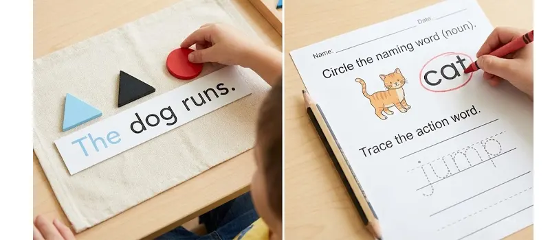 - Montessori: Uses tactile materials like sentence strips and colored symbols to represent parts of speech. These materials are visually appealing and interactive.