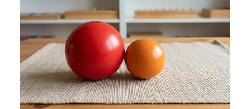 - The Verb (Red Sphere): The verb is a large red circle. Dr. Montessori chose the color red to symbolize fire, blood, and the sun, all of which represent life and energy. The sphere shape suggests movement, as a ball can roll and bounce. This signifies that verbs are action words that drive the sentence forward.