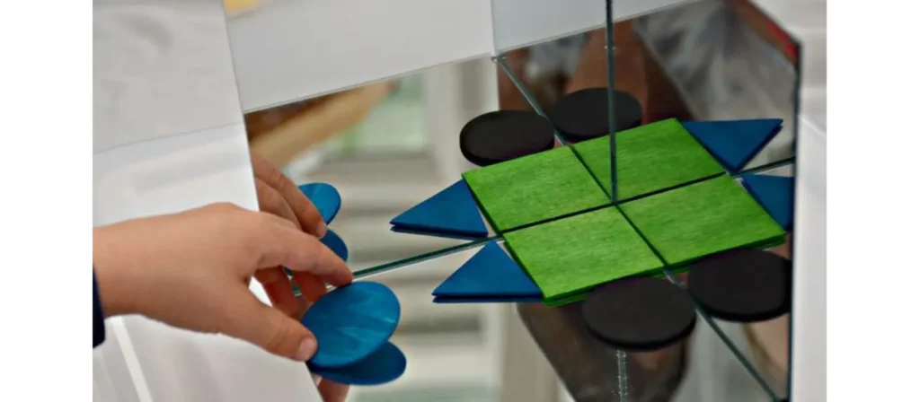 - Ask them to build a shape or pattern on one side of the mirror only.