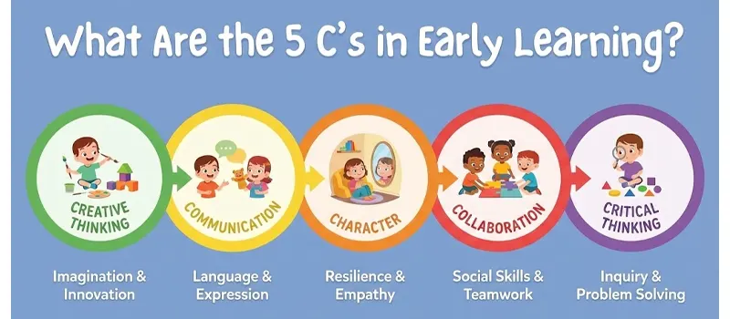 The 5 C’s in early learning refer to five key competencies that support children’s overall development: Communication, Collaboration, Critical Thinking, Creative Thinking, and Character. These skills are not academic subjects. Instead, they describe how children interact with others, explore ideas, solve problems, express themselves, and develop a sense of responsibility.