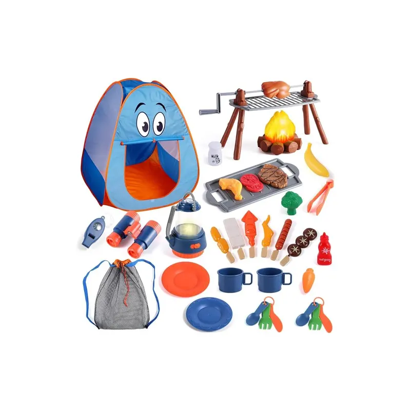 Adventure-themed props such as binoculars, compasses, flashlights, camping cookware, and exploration accessories that turn play into an outdoor-inspired scenario. Pieces are designed to be durable and easy to organize, with materials that clean up quickly.