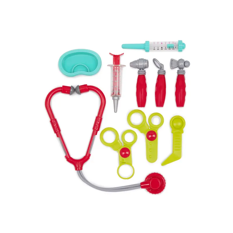 A full medical role play kit featuring safe, rounded tools like stethoscopes, thermometers, syringes, and bandage props. Designed for classroom routines, easy to sanitize, and built from durable materials that resist cracking or bending.