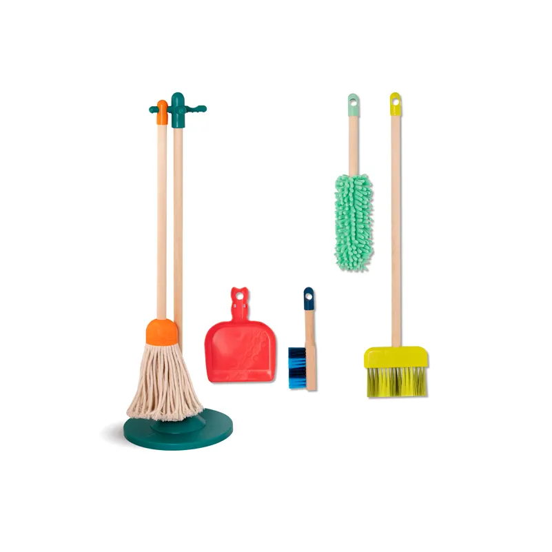 Child-sized cleaning tools such as brooms, mops, dustpans, brushes, and pretend spray bottles that encourage practical, everyday role play. These sets are made with durable handles and simple structures that are easy to wipe down and store neatly after use.