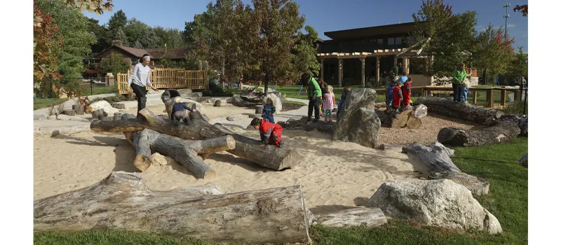 Safety is achieved through thoughtful layout, impact-absorbing surfaces where needed, clear supervision sight lines, non-toxic materials, stable equipment, and defined boundaries. The goal is to allow appropriate physical challenge while minimizing hazards.