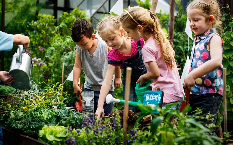 The nature and gardening zone helps children connect with living systems and seasonal changes. It should be located near water access and designed for small-group interaction. This zone encourages responsibility, observation, and environmental awareness.